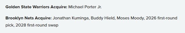 篮网得到:乔纳森-库明加、巴迪-希尔德、摩西-穆迪、2026年首轮签、2028年首轮签互换权